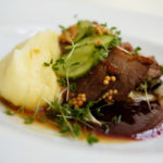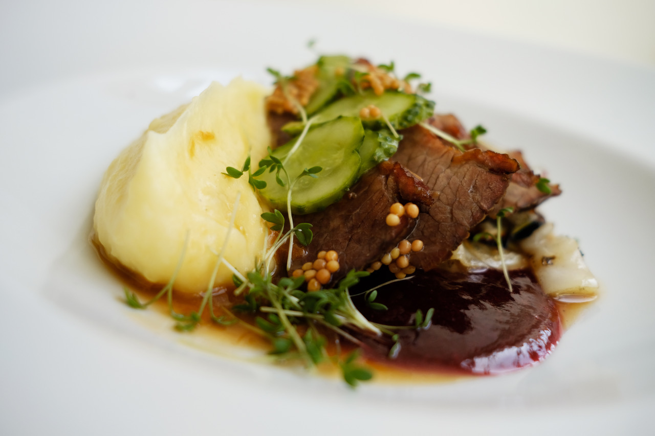 Nötbringa med senap, gurka och kål. Potatispuré och vinägersky