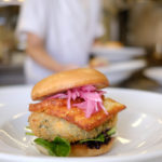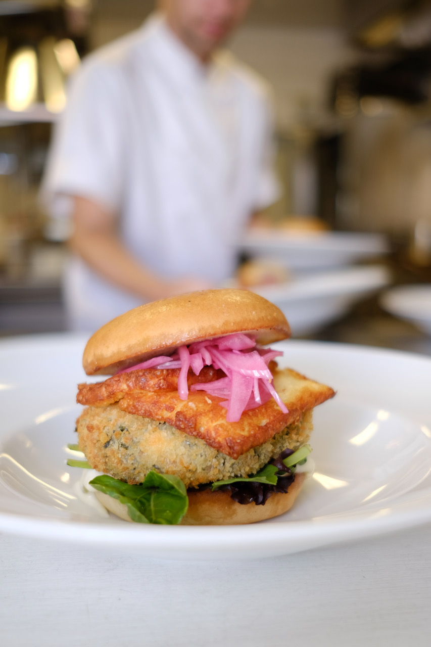 Bönburgare med spenat och halloumi. Jalapenomajonnäs och picklad lök