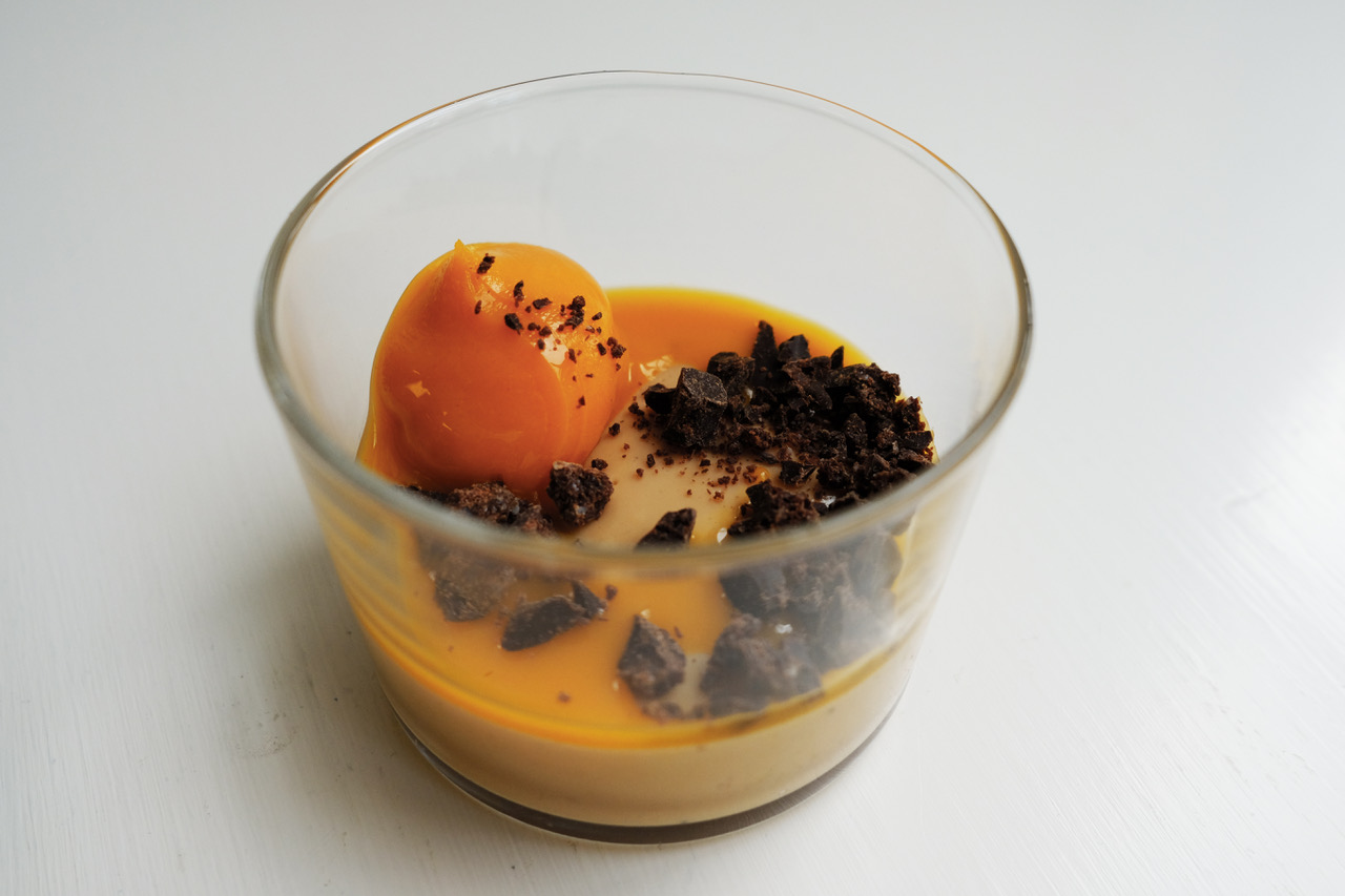 Karamellpudding med havtorn och mörk choklad