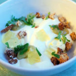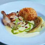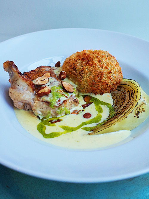 Smörbrynt kycklingbröst, syrad gräddsås med vårlök, potatiskrokett med parmesan, rostad mandel & eldad kål från källsprångs gård.