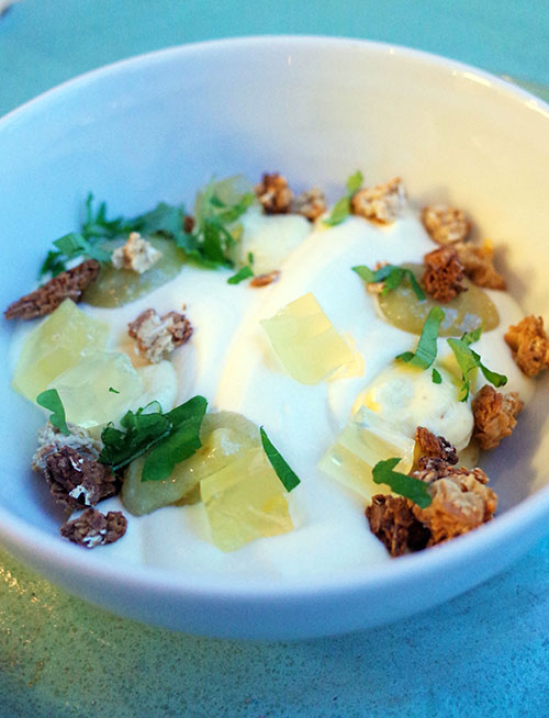 Vit chokladmousse, krusbärscreme, citron & rostad havre.