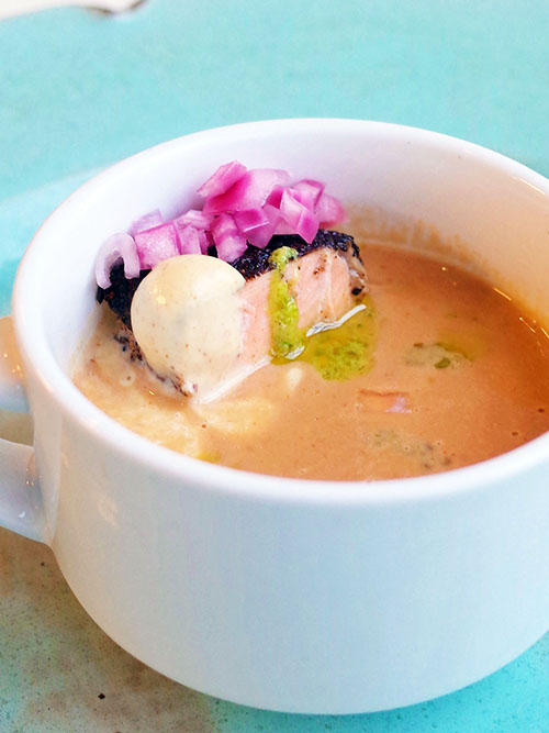 Hummersoppa toppad med sotad lax, picklad rödlök & rostad grädde.