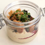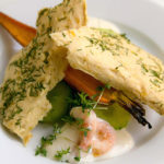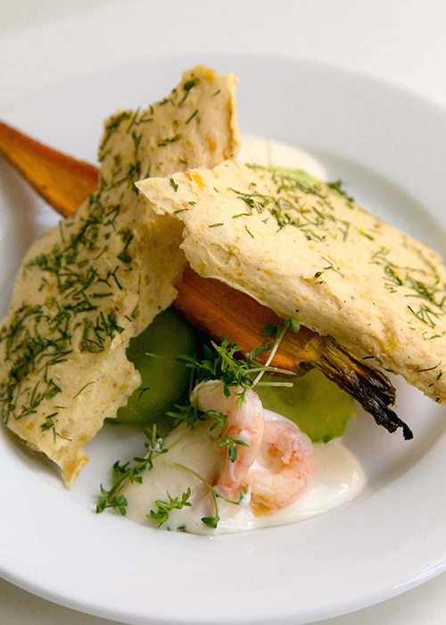 Alrökta räkor, gurka, citron, morot samt potatiscrisp med dill