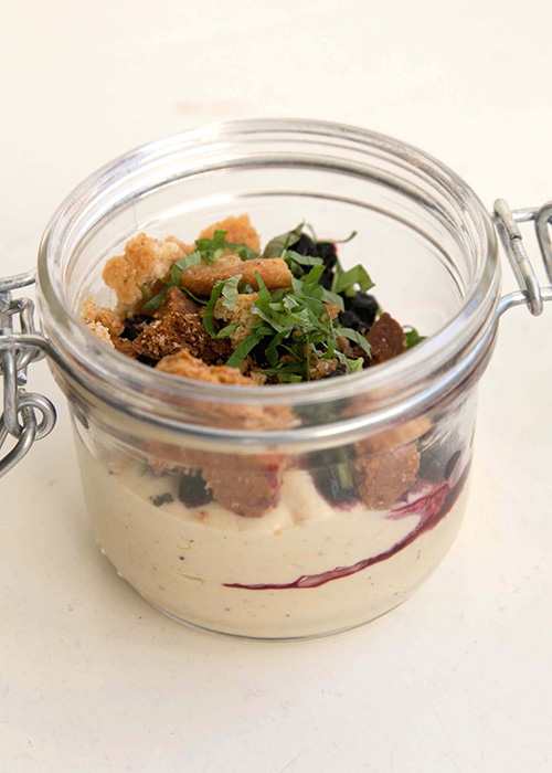 Mörk vaniljpudding, rårörda blåbär samt brûléekaka med citron