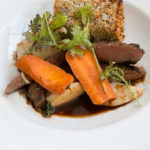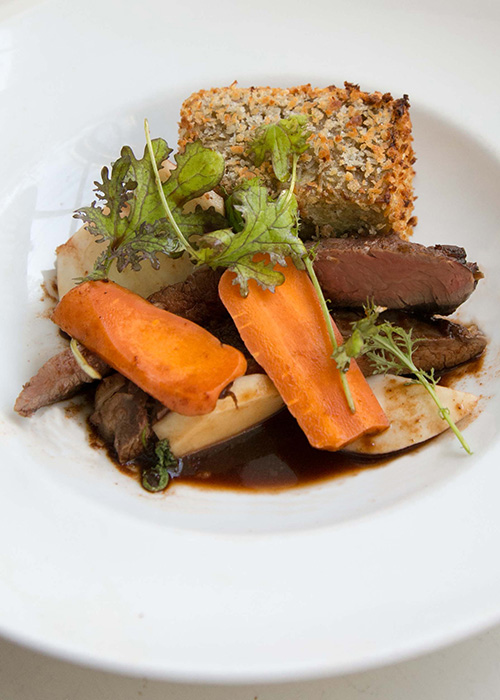 Långbakad flankstek, syrad rotselleri & morot, tomatsky samt potatiskrokett med timjan och Gruyère